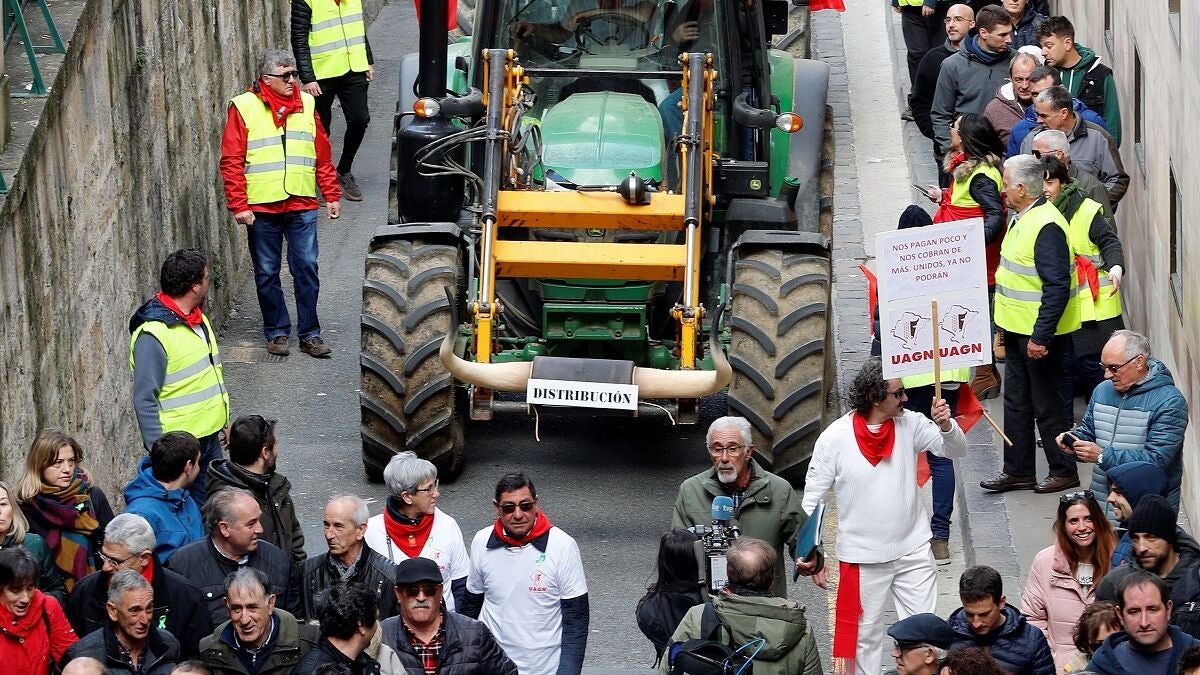 La protesta ha querido ser un encierro simulado donde los tractores se han disfrazado de toros y los asistentes han cantado al Santo antes de continuar su marcha por el recorrido del encierro hasta la Plaza de las Merindades.