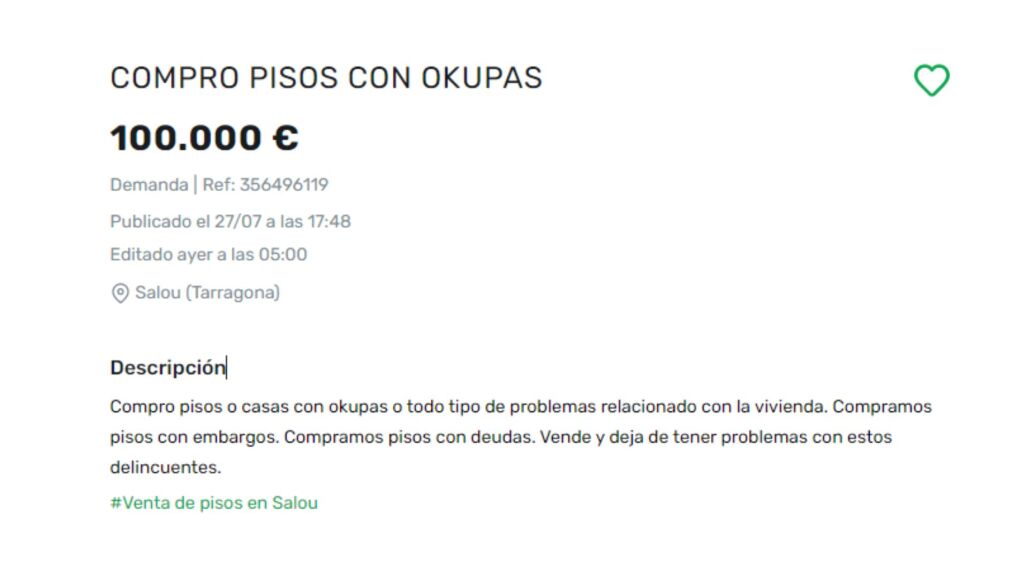 Hay empresas que ya se dedican a ir a la caza de este tipo de "gangas" inmobiliarias, que pueden resultar interesantes como inversión. Este perfil de comprador busca expresamente "casas con okupas o todo tipo de problemas", como "embargos o deudas". Como este anuncio, donde animan a los propietarios a quitarse de encima a los okupas: "Vende y deja de tener problemas con estos delincuentes".