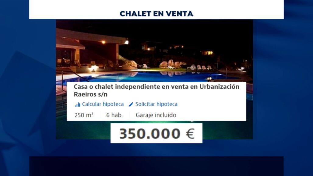El chalet esta ubicado en una urbanización de lujo, en San Vicente de Mar, en Pontevedra, y se ha puesto a la venta por 350.000 euros. Lo que no dice el anuncio es que sobre todo este conjunto de 52 viviendas pesa una orden de derribo inmediata por encontrarse en terrenos de especial protección de costas.