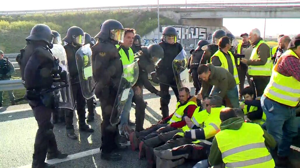 En las imágenes, se comprueba cómo se han vivido momentos de cierta tensión con la Guardia Civil, que han tratado de frenar el avance de los manifestantes que pretendían cortar la vía.