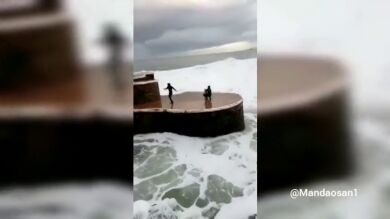 Juegan a protegerse de las embestidas del mar detrás del espigón. Pero la fuerza del agua arrastra dos de los bañistas.
