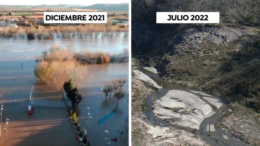 Apenas siete meses han pasado entre una imagen y otra. Las fuertes lluvias de finales de 2021 anegaron de agua varios municipios y, apenas medio año después, esas mismas localidades ven como la escasez acuática genera una nueva situación crítica que afecta gravemente a la población. Ya se han producido los primeros cortes de agua en la Comunidad Foral de Navarra y se trabaja para paliar el estado de la zona.