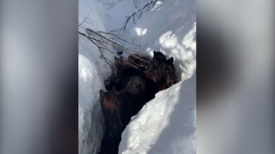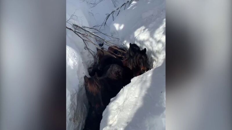 Los caballos consiguieron resguardarse del temporal durante la noche gracias a un arroyo vacío que había formado la nieve. Sin embargo, salir de ahí por su propia pata fue misión imposible.