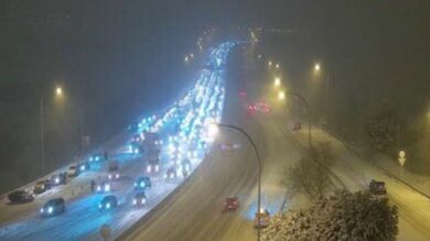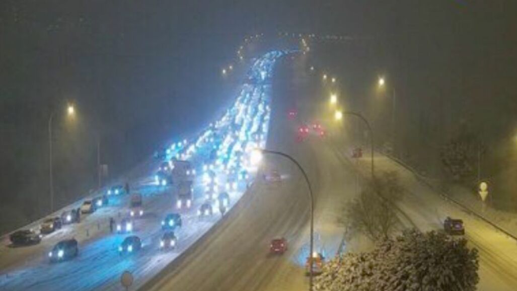 El acceso a Madrid desde la M-30 hacia la carretera A3, hacia la Comunidad Valenciana hay kilómetros de coches parados sin poder avanzar por la nieve.
