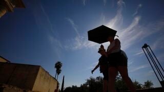 Unos turistas se protegen del sol en Córdoba en plena ola de calor
