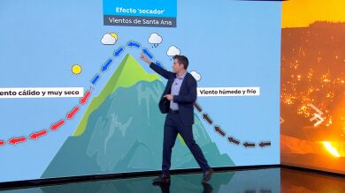 Detrás de la rápida propagación del fuego está el conocido como 'efecto secador', conocido en EEUU como los vientos endemoniados de Santa Ana. Este fenómeno ha llegado en dirección este y ha comenzado a ganar intensidad a su paso por California y Los Ángeles. Estos vientos se han encontrado con cadenas montañosas a su paso. El viento llegaba húmedo y frío y comenzaba a ascender. Posteriormente, en su descenso se ha calentado en la atmósfera. Tal y como explica César Gonzalo, "en el momento de descender pierde esa humedad por completo y lo que se produce en ese descenso es que se calienta rápidamente. En definitiva, tienen un viento muy caliente y sobre todo muy seco".