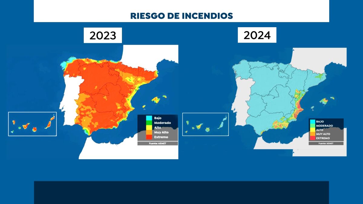 En el mapa de riesgo de [[LINK:INTERNO|||Article|||667328e5cf44b0e4c4b80a4f|||Aemet]] se puede hacer una comparativa entre el verano pasado y el actual, como se puede ver en el vídeo de la parte superior. En el 2023 el color rojo de alto riesgo predomina mayoritariamente. En el mapa del riesgo actual, el color azul de riesgo bajo impera en el territorio nacional.
