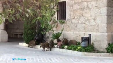 Con su móvil grabó la escena, en la que se contempla cómo los agentes locales logran ahuyentar a los jabalíes, una madre con sus nueve jabatos, que estaban campando a sus anchas por el centro. Con el ruido del claxon del coche patrulla y de una bandeja han animado con éxito a que los animales regresaran a su habitat natural, colindante a la localidad de Torrelodones.