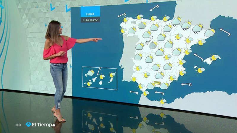 En el norte de las islas Canarias de más relieve, probables lluvias débiles y dispersas; predominio de poco nuboso o con intervalos de nubes altas en el resto del país.