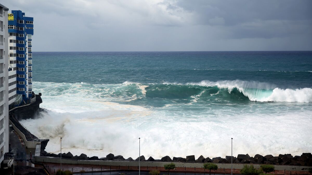 La localidad de Garachico (Tenerife) está haciendo frente este jueves al primer mar de leva del otoño, con olas superiores a los tres metros y que pueden alcanzar los 4,5. De momento está dejando imágenes impactantes en las que el fuerte oleaje toca tierra e invade terrazas, las piscinas y la avenida en general.