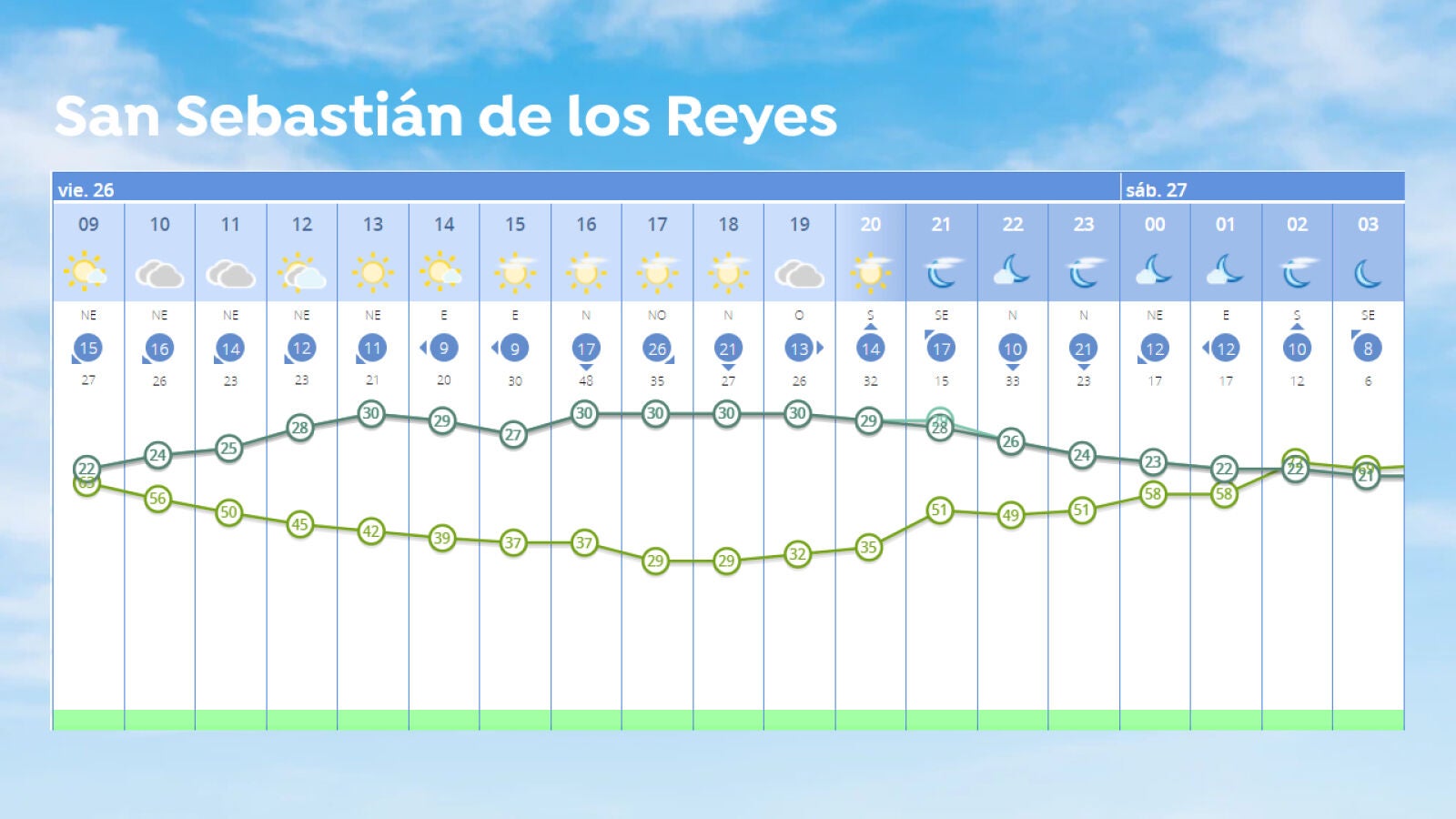 Entrada la semana, las temperaturas serán mucho más otoñales que las registradas a comienzo de esta semana. a partir del miércoles de la próxima semana, no se esperan precipitaciones y desde eltiempo.es detallan que las máximas llegarán hasta los 31 grados. Las fiestas de San Sebastián de los Reyes finalizan el próximo 4 de septiembre.