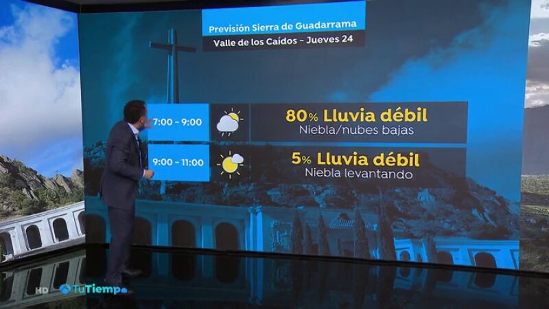 A lo largo del jueves el tiempo irá cambiando en toda España: se irán alejando las lluvias y volverán a subir las temperaturas. Esta mejoría será progresiva también en el Valle de los Caídos. La previsión para la Sierra de Guadarrama es de un 80% de lluvia en las primeras horas del jueves. A partir de las 9 de la mañana esa probabilidad se va reduciendo hasta quedar tan solo en un 5% a las 11,00 horas. Es decir: que esté lloviendo en el momento previsto de la exhumación, a las 10:30h es poco probable, y en cualquier caso la lluvia sería débil.