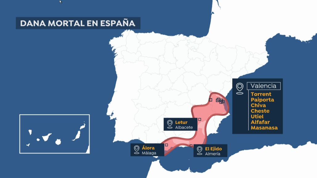 Pero, sin duda, la peor parte de la DANA se la están llevando algunos lugares muy concretos. Estos son Torrent, Paiporta, Chiva, Cheste, Utiel, Requena, Alfafar y Massanassa (todos en Valencia) y Álora (Málaga), Letur (Albacete) y El Ejido (Almería).