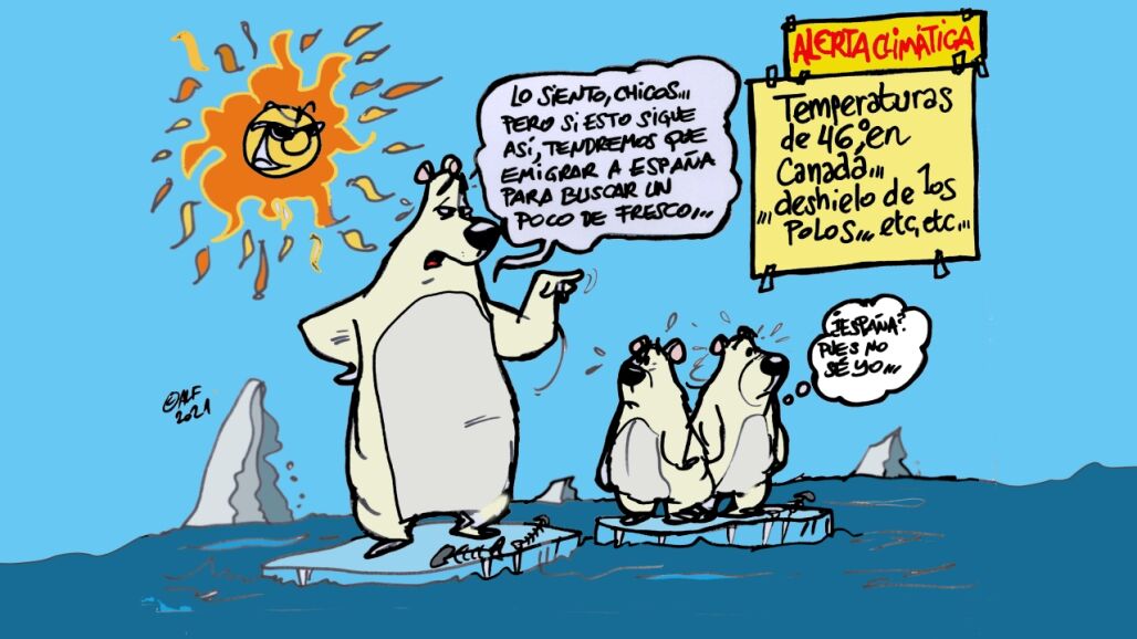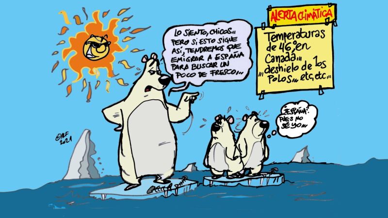 El registro de estas temperaturas en los dos países ha vuelto a poner en alerta a los científicos, que avisan de las innegables consecuencias del cambio climático. Es lo que recoge la viñeta semanal de Alfredo Boto-Hervás, que advierte sobre el incesante deshielo de los polos que provoca esta alerta climática.