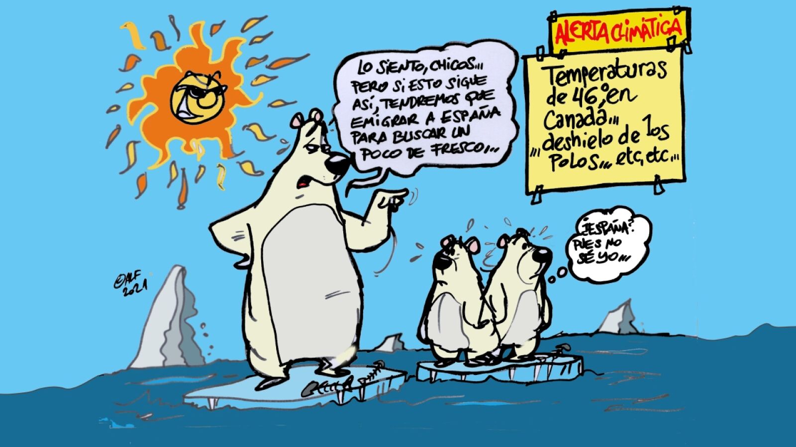 El ilustrador de Antena 3 Noticias dibuja a un grupo de osos polares en busca de un lugar para vivir ante la falta de superficie helada en los polos. "Lo siento chicos, pero si esto sigue así, tendremos que emigrar aa España para buscar un poco de fresco", dice uno de llos. "España, pues no sé yo...", lamenta otro animal.