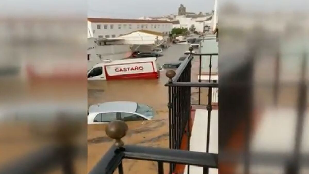 En Lepe (Huelva) la DANA ha provocado que una tromba de agua haya derribado el muro de un colegio de primaria. En pocos minutos había coches flotando, semáforos caídos y hasta un incendio que ha provocado un rayo.