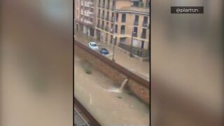 Estas imágenes se han podido ver esta misma tarde de la localidad zaragozana de Tarazona en la que una fuerte tromba de agua ha anegado las calles y ha provocado inundaciones. Son las primeras consecuencias de la potente DANA que ya recorre la mitad norte peninsular. El riesgo de inundaciones es elevado y las autoridades piden a la población prudencia y que eviten acercarse a los ríos.