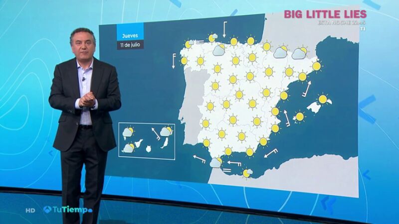 Predominio de cielos poco nubosos o despejados, aunque con nubes altas en la mitad sur peninsular, algunas nubes bajas al principio en el norte de Galicia, el Cantábrico occidental y Cádiz e intervalos nubosos de evolución diurna en zonas de montaña del norte y centro peninsular. No se descarta algún chubasco o tormenta dispersa y ocasional en Pirineos. En Canarias, posibilidad de lluvias débiles y ocasionales en el norte de las islas.
