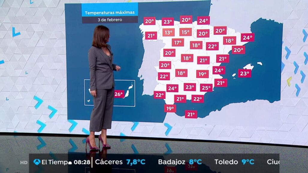 Temperaturas con pocos cambios en el área mediterránea y Canarias. En el resto de la Península temperaturas diurnas en aumento y nocturnas en descenso en general. Mantendrán valores muy altos para la época del año, con alguna helada débil sólo en algunas zonas de Pirineos.