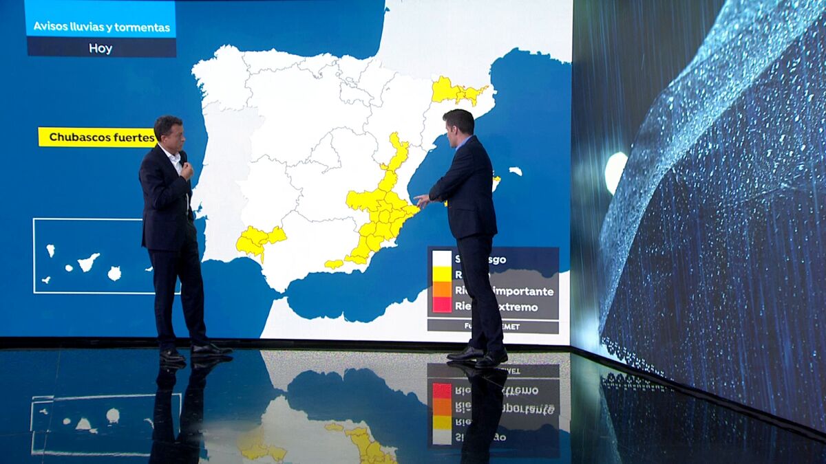 Hoy se vuelven a activar los avisos de nivel amarillo, de momento, por chubascos muy intensos en el este de Andalucía, La Región de Murcia, Albacete, Alicante, interior de Valencia, de Castellón, en Mallorca, en Teruel y en el Pirineo Catalán. En todas estas zonas en tan solo una hora se pueden acumular de 15 a 20 litros/m2. En el caso de Murcia la AEMET recalca la posibilidad de fuertes granizadas. En el otro extremo del país en Huelva en Huelva se esperan fuertes tormentas en el norte.