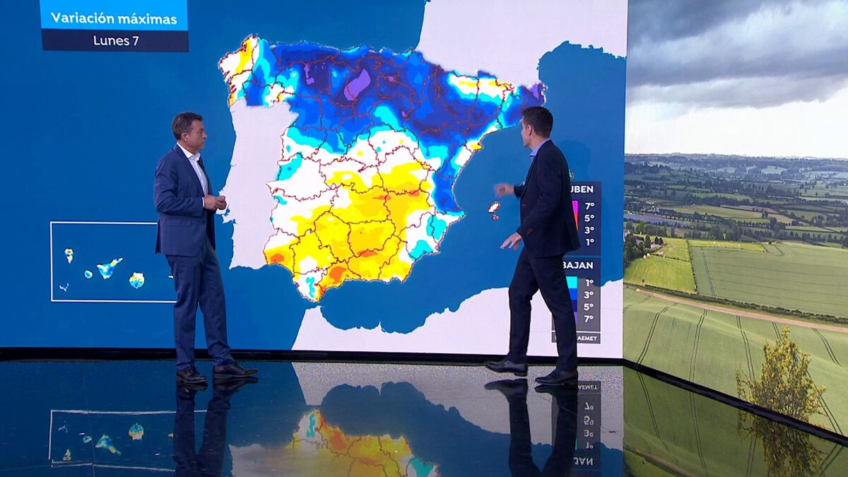 Así hemos rotulado la intervención del tiempo en las Noticias de la Mañana, calor por barrios, porque en cada región del país las temperaturas tendrán tendencias diferentes. Buena noticia para el interior de Andalucía, Extremadura y sur de Castilla-La Mancha con temperaturas que bajarán de cara al jueves y viernes, para quedarse con unos 36ºC. En cambio, en Castilla y León, Aragón, Navarra, La Rioja la tendencia es la opuesta: después de la bajada de hoy, poco a poco el calor regresará para rozar los 37ºC. En el extremo norte el que se irá marchando progresivamente será el ambiente fresco o casi frío. Donde apenas tendremos variaciones será en el centro con termómetros prácticamente estables, que apenas bajarán de los 37ºC como por ejemplo en Madrid y Toledo.