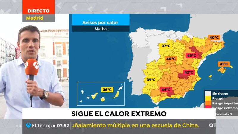 En la jornada de hoy estas altísimas temperaturas se pueden volver a repetir, sobre todo en el este del país donde hay avisos de nivel rojo, riesgos extremo, que aparecen en Zaragoza, Teruel, Albacete y Granada con máximas que se acercarán a los 44º medidos a la sombra.