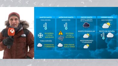 Ese Martes Santo es precisamente el día más frío de la semana y deja nieve a cotas relativamente bajas en las principales áreas montañosas de toda la Península. El meteorólogo de Antena 3 Noticias, César Gonzalo, experimenta en primera persona la bajada de temperaturas y la nevada desde el puerto de Navacerrada, situado entre Madrid y Segovia, en pleno Sistema Central, y que ha vuelto a ser cubierto por un manto blanco.