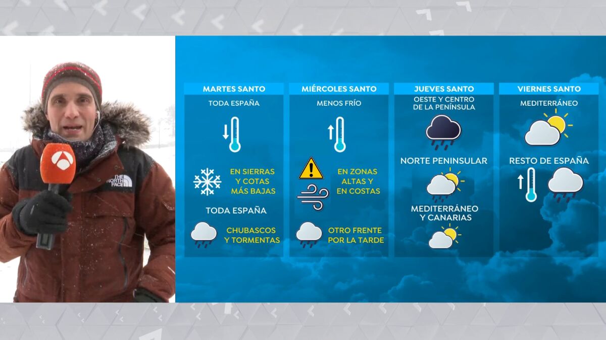 César Gonzalo proporciona unas pinceladas para los próximos días, en los que va a seguir llegando abundante nubosidad. Mañana, Miércoles Santo, se recuperarán ligeramente las temperaturas, ya hará menos frío al mismo tiempo que seguirá soplando el viento y un nuevo frente llegará de cara a la tarde. El Jueves Santo podrá ser el día más lluvioso de la Santa Semana, probables lluvias intensas en zonas del oeste y el centro peninsular, más débiles en el norte, menos probables cuanto más el este, y que no se producirían en el Mediterráneo y Canarias. Las temperaturas seguirán recuperándose y continuarán haciéndolo el Viernes Santo, que volverá a predominar lluvioso salvo en el Mediterráneo.