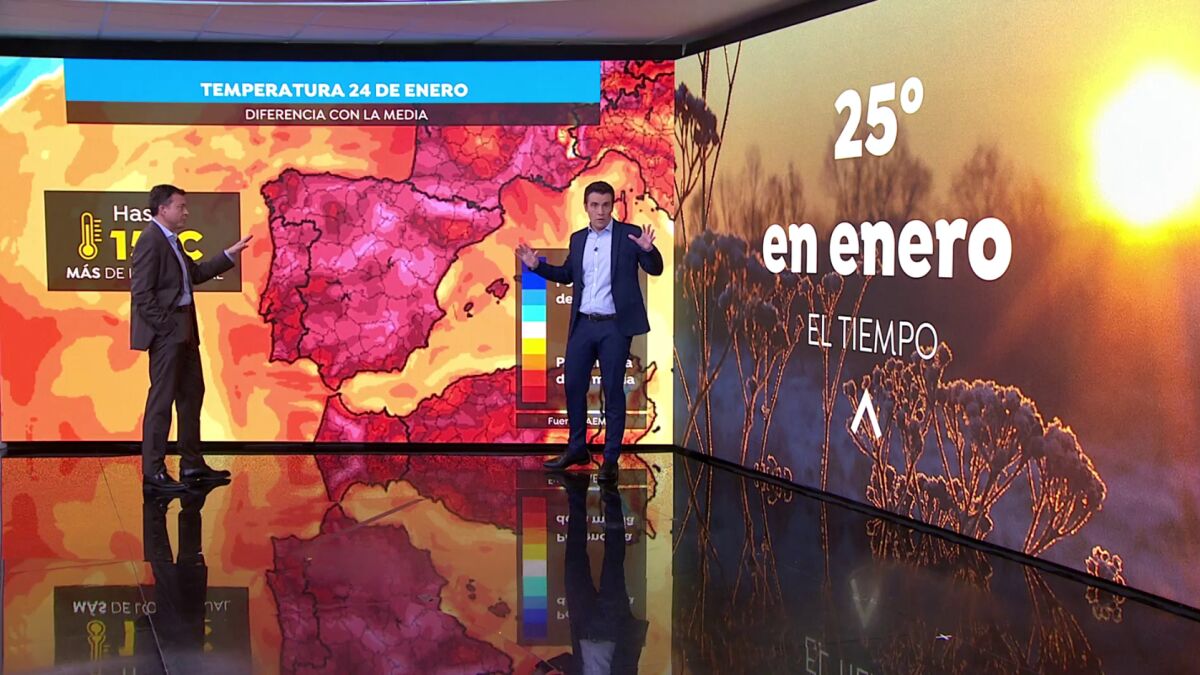 A partir del mediodía notaremos como las temperaturas son aun más elevadas que las de ayer. Con una subida marcada en el centro y este peninsulares, que dejará valores que van a quedar hasta 15ºC por encima de lo que toca en un 24 enero, se dice pronto. Vamos con las temperaturas, hoy de plena primavera: 17ºC se prevén en Madrid, Zaragoza, Ciudad Real, A Coruña y Logroño; 19ºC alcanzarán en Cáceres y Bilbao; De 20º a 21ºC se esperan en Ourense, Soria Palma, Albacete, Cádiz y Melilla. Las más calurosas se esperan en Murcia con 25ºC; en Sevilla rozarán los 24ºC; en Valencia los 23ºC; en Teruel alcanzarán unos insólitos 22ºC en enero.