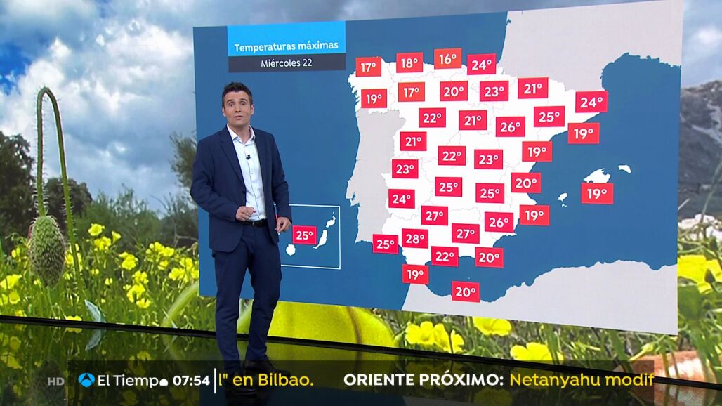 Lo que no para de subir es la temperatura, hoy de nuevo sumaremos un par de grados en Andalucía, Castilla-La Mancha. En la mitad norte la subida será más marcada, especialmente en el País Vasco, Navarra, La Rioja, norte de Aragón y también en Canarias. De manera que durante esta tarde se alcanzará hasta 28ºC a la sombra en Sevilla; 26º en Zaragoza; 25º en Ciudad Real, Lleida y Santa Cruz de Tenerife; 24º en Donosti y 22º en Valladolid. Solo en Galicia es donde bajarán ligeramente las temperaturas con unos 17º previstos en A Coruña.