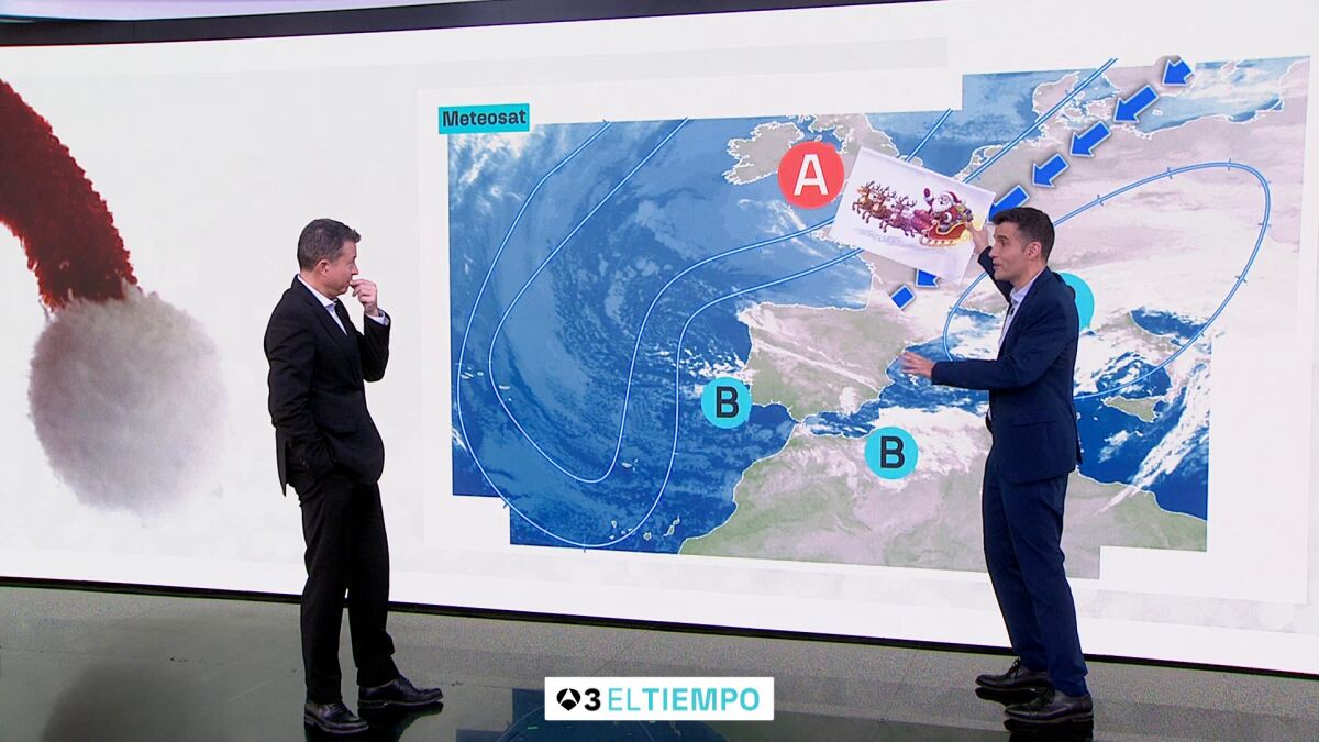 En total Papá Noel pasa unas 24 horas repartiendo regalos en todo el Planeta. Este año cuanto llegue a nuestro país tendrá que abrigarse, porque a buen seguro se aprovechará de los vientos que empujan una nueva masa de aire polar. De tal forma que seguramente entrará por el norte de la Península, tratando de esquivar las borrascas que nos rodean. Para finalmente terminar su reparto en las Islas Canarias. Tendrá que darse prisa, si se retrasa se va a encontrar con unas primeras horas del día de Navidad muy frías, con heladas generalizadas.