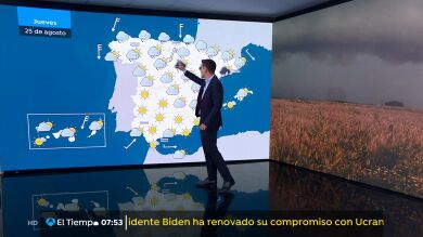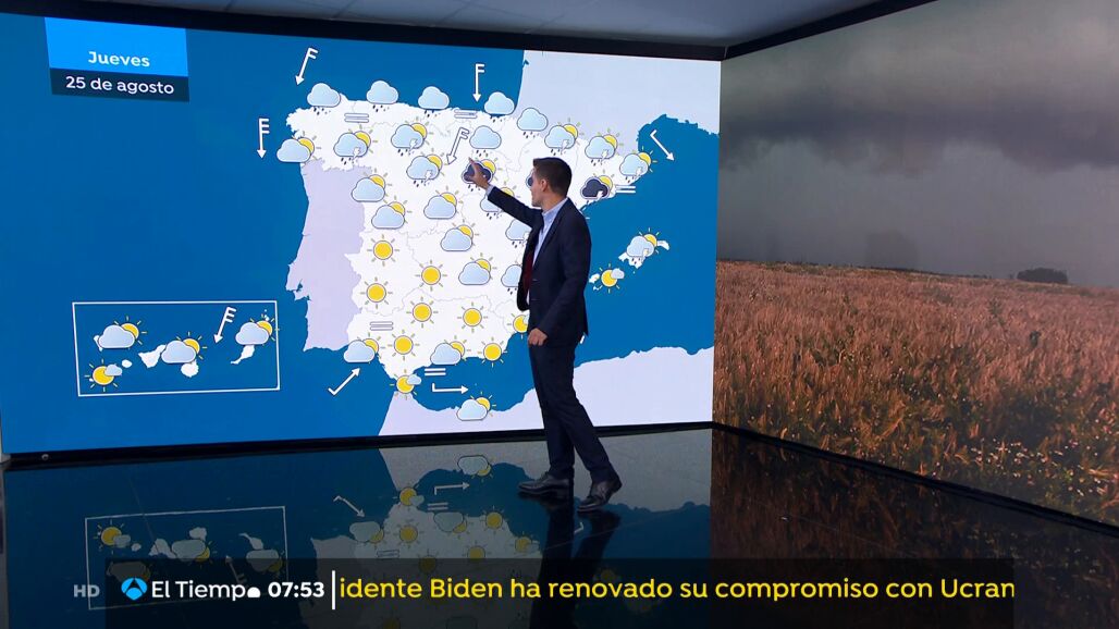 Habrá hasta menos 7 grados en el norte de Castilla y León y comunidades del Cantábrico. Las máximas no pasarán de los 36 grado en puntos del norte de Extremadura. Así va a terminar hoy y el viernes arrancará de nuevo con esas nubes acumuladas en el norte. Por la tarde el viernes las tormentas pueden volver a aparecer en el este de la Península. Con este tiempo revuelto continuaremos el sábado con lluvias rondando las costas del Mediterráneo.