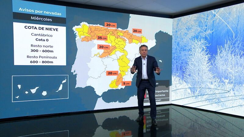 Las nevadas continúan en las montañas del norte, y según vaya pasando las horas irá apareciendo a menor altitud. Hasta la tarde se mantiene el aviso de riesgo extremo por nevadas en el Pirineo de Huesca. Los avisos por nevadas siguen en la cordillera cantábrica, norte de Castilla y León, La Rioja, y Navarra. La novedad del día la en encontramos en el centro: En la sierra de Madrid, en Segovia, Ávila, puntos de Zamora, y Salamanca hoy por la tarde llegarán las nevadas. Según vaya bajando la cota de nieve de 1.200m a unos 700m al final de la jornada.No nevará en Madrid capital según las previsiones.