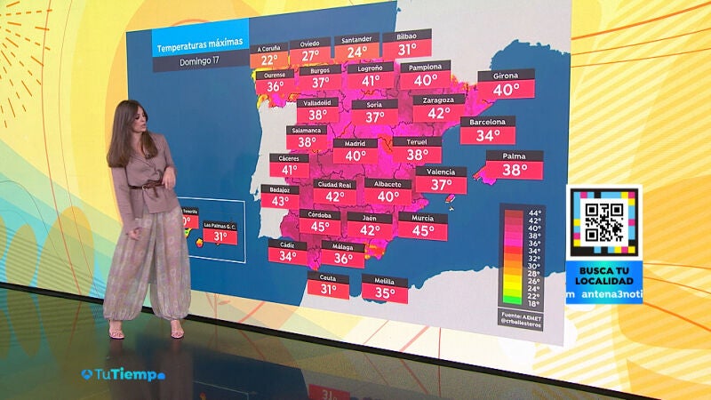 Mañana domingo el calor seguirá siendo muy intenso, con avisos en buena parte del país. El nivel rojo se mantiene en el valle del Guadalquivir: hasta 45 ºC en Córdoba y 44 ºC en Sevilla. En el aviso naranja se sitúan amplias zonas del centro, este y sur peninsular: 42 ºC en Zaragoza, 41 ºC en Baleares y alrededor de 40 ºC en Murcia y en la Comunidad Valenciana. En el resto, las máximas oscilarán entre 36 y 41 ºC, todavía con calor sofocante, y en Canarias se esperan entre 34 y 36 ºC.
