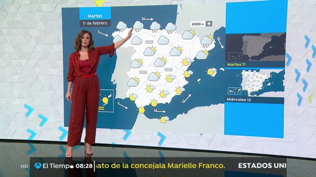 El cielo estará nuboso en Galicia, con lluvias en general débiles, sobre todo en el oeste y al principio, tendiendo a disminuir a lo largo del día. Poco nuboso aumentando a nuboso en el Cantábrico oriental y norte de Navarra, con posibilidad de alguna lluvia débil.