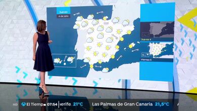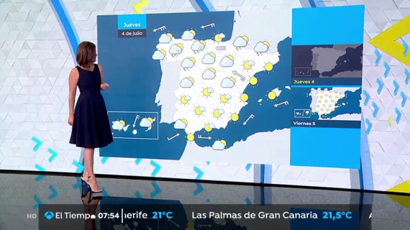 Nuboso o con intervalos nubosos en Galicia y Cantábrico, con posibilidad de algunas lloviznas al principio. En el resto de la Península y en Baleares, poco nuboso o despejado, aunque con algunos intervalos nubosos al principio en el oeste de Andalucía y con nubosidad de evolución diurna en el norte y el este. Se esperan tormentas, que podrían ser localmente fuertes, en la cordillera Cantábrica, los Pirineos y el norte de la meseta Norte y del sistema Ibérico. De forma más débil y dispersa, no pueden descartarse en el sur del sistema Ibérico y en las montañas del sureste. En Canarias, nuboso en el norte de las islas, con posibilidad de alguna lluvia débil en las de mayor relieve, y poco nuboso en el sur.