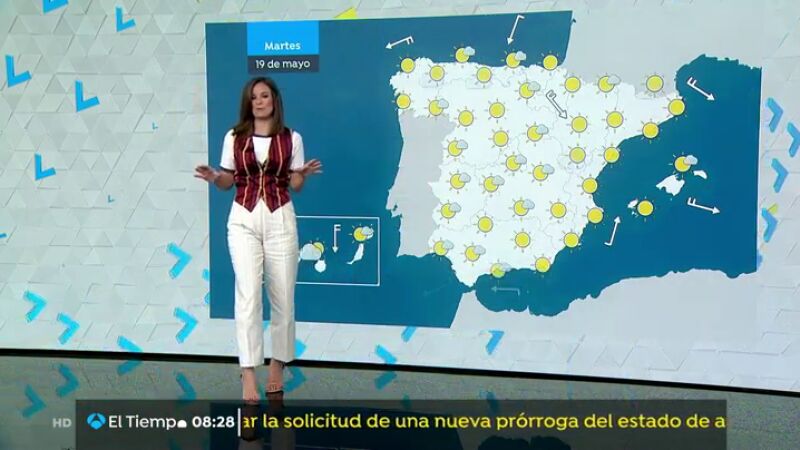 En Canarias, intervalos nubosos en el norte, con posibilidad de alguna llovizna puntual en las islas más montañosas, y poco nuboso en el sur. Aparecerán algunas nubes bajas o brumas matinales en el interior noroeste y alto Ebro.