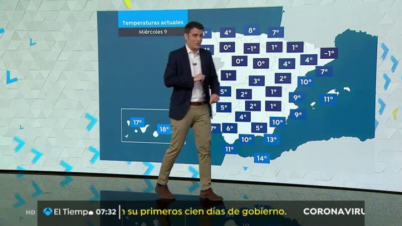 Temperaturas diurnas en ascenso en el extremo noroeste peninsular, en ligero descenso en el sur y Baleares, y con pocos cambios en el resto. Nocturnas en descenso en la mitad sur peninsular, con heladas en zonas de montaña de la mitad norte, del centro y del sudeste, más intensas en Pirineos así como, más débiles, en zonas llanas de ambas mesetas.