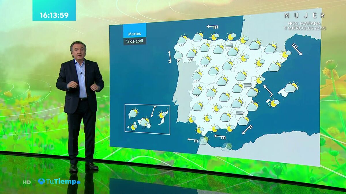 En Canarias, poco nuboso con intervalos nubosos dispersos y baja probabilidad de chubascos en el interior de las islas de más relieve.