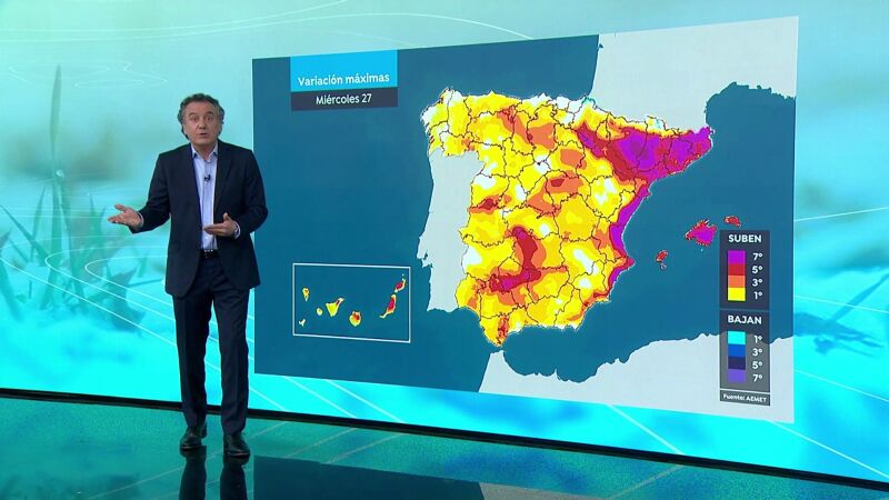 Temperaturas diurnas en ascenso casi generalizado, notable en la cuenca del Ebro, litoral de Levante y Baleares. Nocturnas en ascenso en el tercio noreste peninsular, localmente notable, y en descenso en la vertiente atlántica, más acusado en la vertiente sur. Heladas débiles sólo en Pirineos.