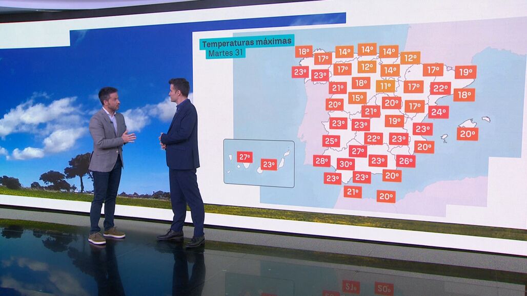 'Levantá' térmica de las temperaturas en la mitad sur con unos sorprendentes 30 grados en Sevilla y valores de hasta 27º en Córdoba. El ascenso será más ligero en el centro donde llegarán a los 20 ºC. En la mitad norte los termómetros apenas van a cambiar, y en cambio en Canarias ascienden de manera marcada fruto del polvo en suspensión que llega desde el Sáhara.