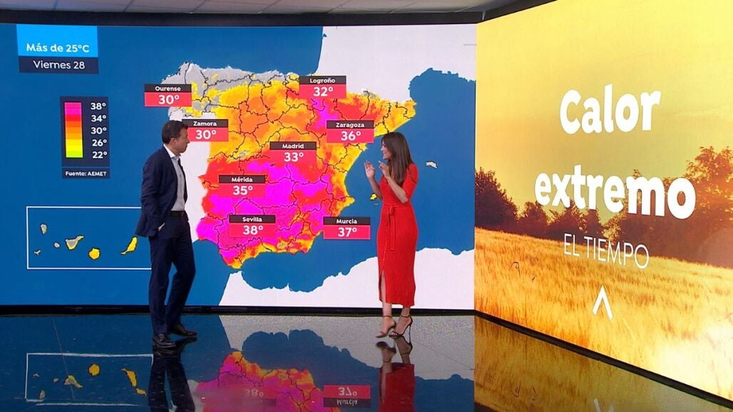 El punto álgido de este episodio es muy probable que se dé entre el jueves 27 y el viernes 28, cuando se superen los 30 ºC en buena parte de la mitad norte peninsular y Baleares, a excepción del extremo norte peninsular. En el Cantábrico y Galicia, aunque los termómetros serán anormalmente altos superando los 25 ºC, no llegarán a los 30 ºC. En la mitad sur peninsular y el valle del Ebro se rozarán de forma generalizada los 35 ºC. Estos valores se superarán ampliamente en el interior del valle del Guadalquivir, donde incluso se podría llegar hasta los 40 ºC. Las temperaturas mínimas también serán anormalmente altas en todo el país, en especial en Andalucía, donde localmente puede haber noches tropicales sin bajar de los 20 ºC.