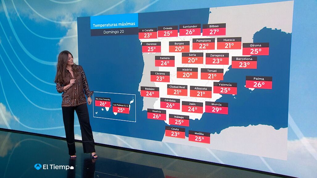 En cuanto a las temperaturas, la tarde de hoy será algo más suave, ya que las máximas empezarán a subir, especialmente mañana. Para el domingo, se espera que las temperaturas oscilen entre los 20°C y los 29°C, con los valores más altos en ciudades como Murcia, que alcanzará los 29°C, Bilbao con 27°C y Santander con 26°C. En las Islas Canarias, las temperaturas se mantendrán agradables, rondando entre 25°C y 26°C. En el centro y sur de la península, ciudades como Madrid, Córdoba y Málaga presentarán máximas entre los 20°C y 26°C.