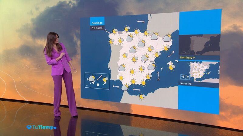 Sábado Santo y Domingo de Resurrección estarán marcados por un tiempo tranquilo, con algo más de nubes bajas en el Mediterráneo, calima en Canarias y nubosidad de evolución en zonas de montaña, donde no se descartan tormentas puntuales a partir de la tarde del domingo, 9 de abril. En Galicia y regiones del Cantábrico, la llegada de un frente poco activo podría dejar lluvias débiles durante la tarde del lunes y madrugada del 10 de abril.