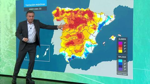 Las temperaturas diurnas subirán en la mayor parte del interior peninsular, excepto en el nordeste y resto del área mediterránea, donde pueden bajar o permanecer sin cambios. Pocos cambios en Canarias.