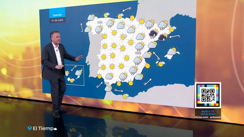 Además del calor predominará el sol mañana jueves salvo en el este de la Península, donde podrían repetirse los chubascos y algunas tormentas más frecuentes en los interiores del nordeste e incluso fuertes en la Ibérica y los Pirineos orientales. De nuevo podrían llegar las lluvia hasta el litoral catalán. También en el noroeste, debido a la entrada de aire húmedo, veremos abundante nubosidad de tipo bajo. Brumas en el Estrecho y nubes en el norte las islas Canarias contemplan el panorama meteorológico previsto para este jueves. Un panorama que se podría complicar a partir del viernes.