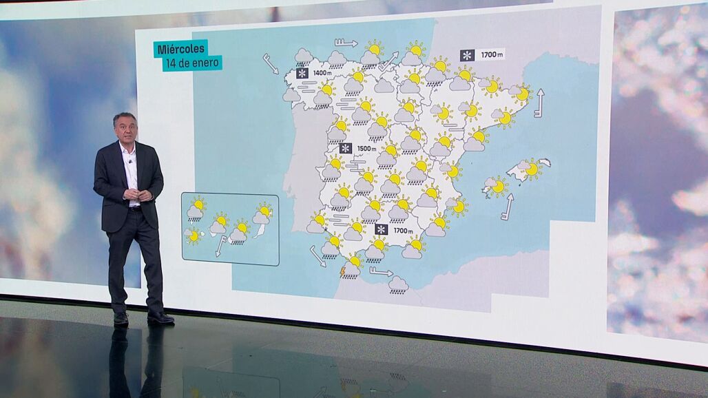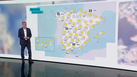 Será una jornada de transición entre este frente que ha entrado hoy -y que irá perdiendo fuerza- y otro que llega el jueves, también por el oeste peninsular, y que además nos dejará temperaturas más bajas. De momento el miércoles todavía tenemos lluvias en buena parte de la península aunque no serán tan copiosas como las que hoy: no dejarán tanta cantidad de lluvia acumulada. Y, como advierten los avisos, con alguna tormenta todavía en el sur de Andalucía, Ceuta y Melilla en las primera horas del día, más probable en litoral de Cádiz. Lluvias también por la mañana y débiles en general tanto en interior del este peninsular como en la zona centro, Galicia y Asturias. Con nevadas débiles también en las montañas a partir de 1500 o 1700 metros. Son poco probables las precipitaciones a orillas del Mediterráneo y esporádicas en el resto del Cantábrico y en Canarias. Y por la tarde ya habrá pasado el frente y se abrirán claros pero también aparecerán bancos de niebla para terminar el día en la vertiente Atlántica.
