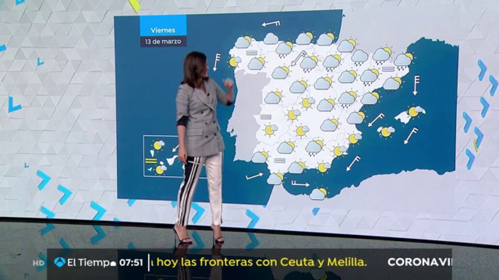 El paso de un frente atlántico hacia el este provocará cielos nubosos en el extremo norte peninsular e interior del tercio oriental. Se esperan precipitaciones dispersas en el Cantábrico y alto Ebro tendiendo a remitir durante el día por el oeste, así como precipitaciones más abundantes en el nordeste peninsular, que tenderán a remitir salvo en Pirineos.