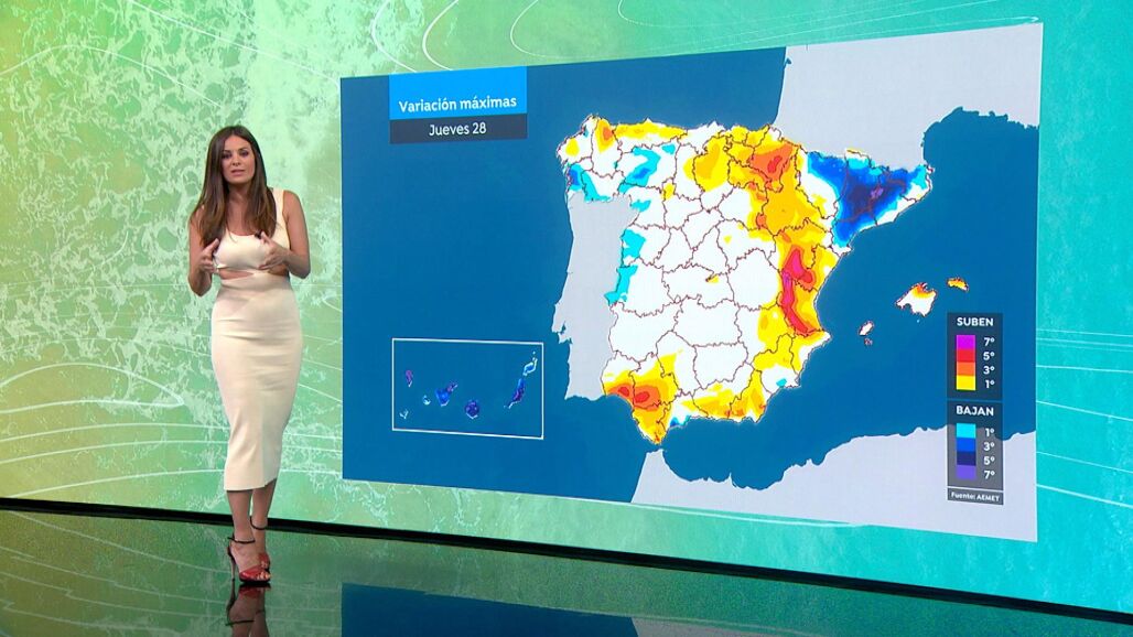 Temperaturas máximas en descenso en Canarias, así como en los tercios sur y este peninsular, llegando incluso a notable en el sur y oeste de Andalucía; en aumento en el norte y con pocos cambios en el resto.
