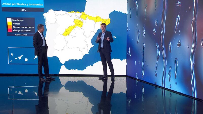 Los avisosactivados por AEMET se van reduciendo A esta hora permanecen activos por fuertes chubascos acompañados de tormentas en Ávila, Segovia, Soria, La Rioja, Navarra, Cantabria, País Vasco, Huesca y Cataluña. En todas estas zonas se esperan fuertes chubascos de 15 hasta 30 litros por metro cuadrado 1 hora. Además, se esperan grandes acumulaciones en el entorno de los Pirineos.